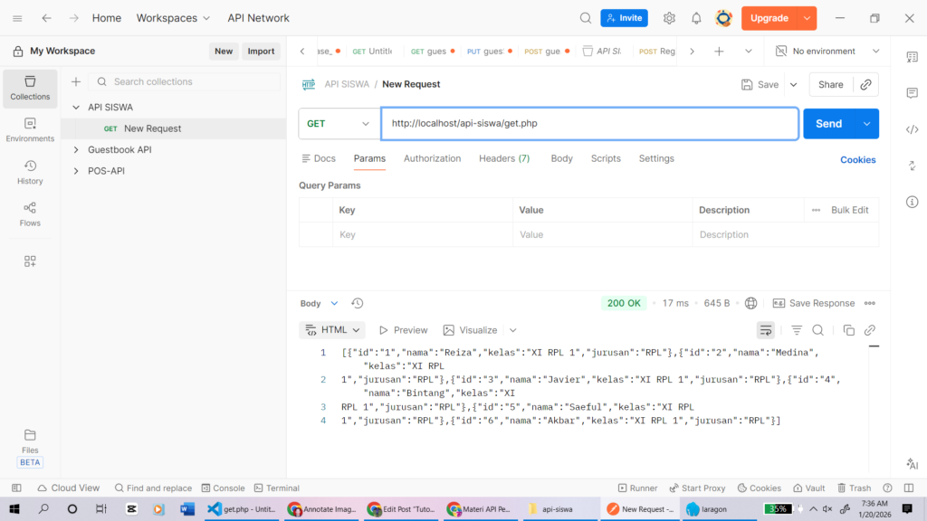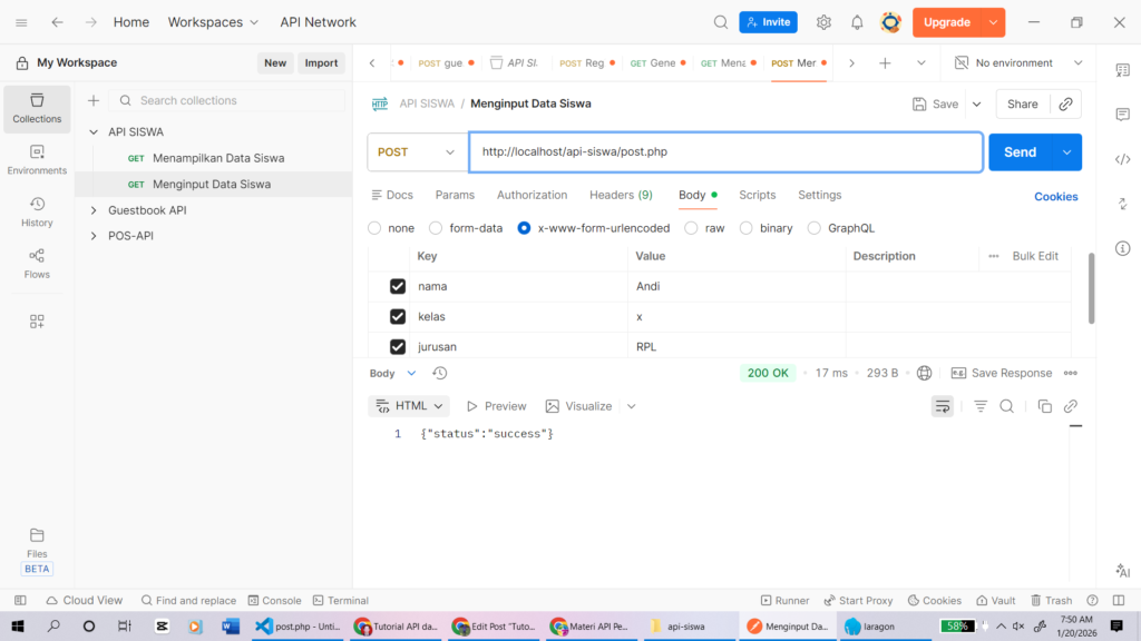 Jika berhasil, cek database db_api -> table siswa di phpmyadmin, apakah datanya sudah bertambah atau belum.