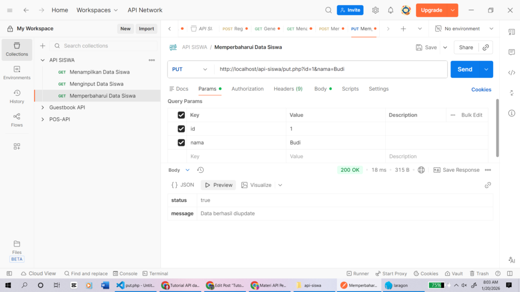 • URL : http://localhost/api-siswa/put.php?id=1&nama=Budi