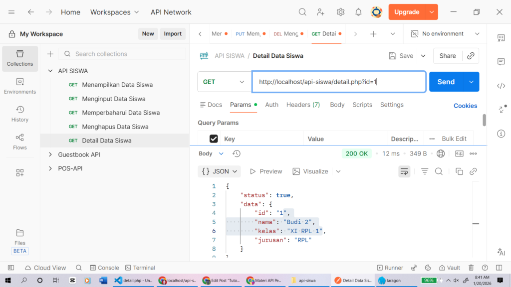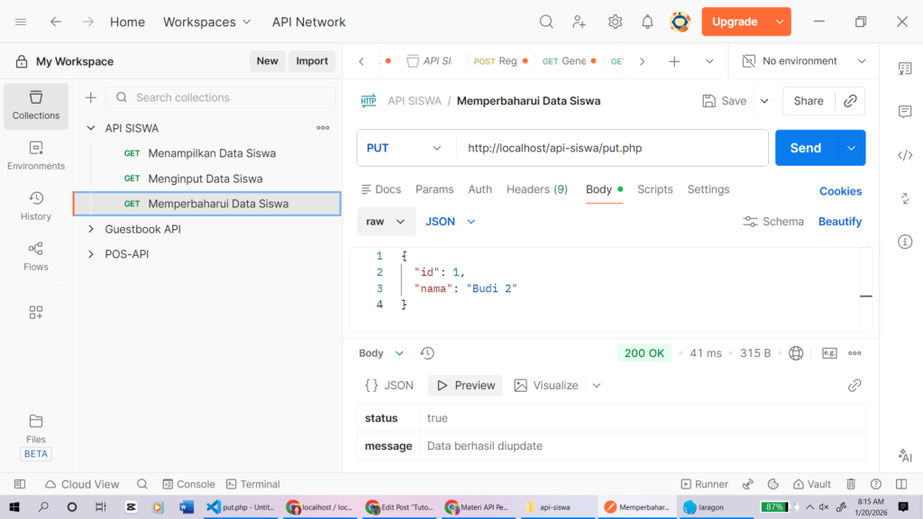 Jika berhasil, cek database db_api -> table siswa di phpmyadmin, apakah data dengan id = 1 sudah berubah atau belum.