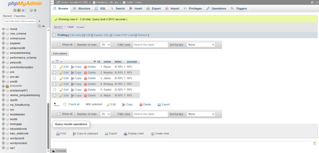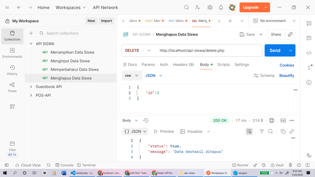 Jika berhasil, cek database db_api -> table siswa di phpmyadmin, apakah data dengan id = 2 sudah hilang terhapus atau belum.