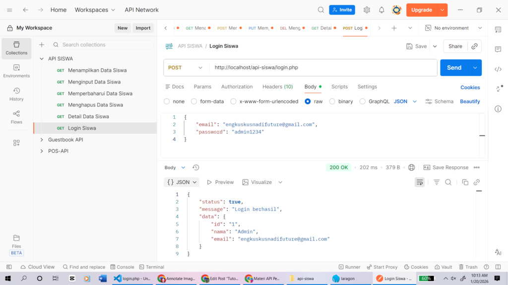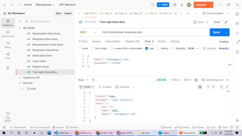 1. cek API Login menggunakan user yang baru ditambahkan dengan memasukan email dan password apakah berhasil memunculkan status 200 OK