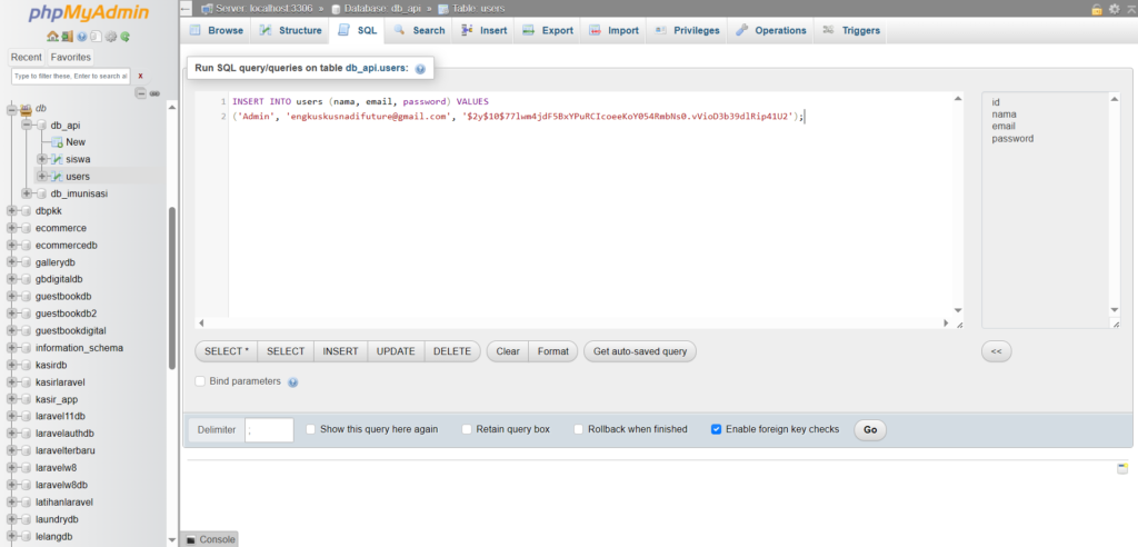 Insert user contoh (password di-hash) misal buat file password.php lalu akses http://localhost/api-siswa/password.php: