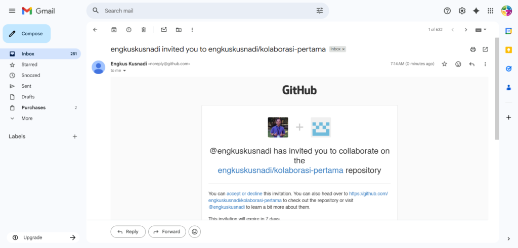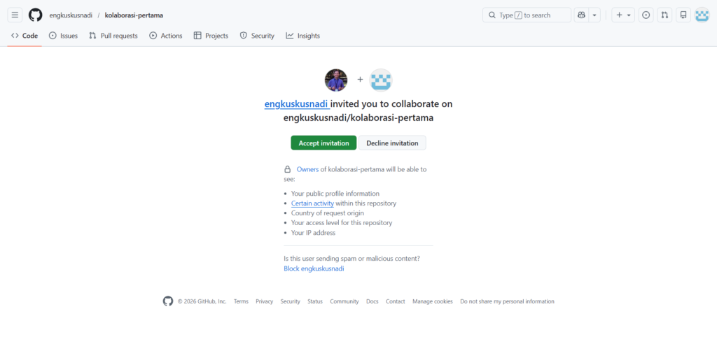 klik tombol accept invitation dan selamat anda sudah berhasil bergabung ke repository owner/leader anda