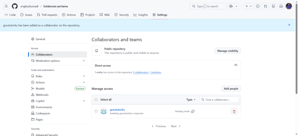 Berikut tampilan collaborators, klik add people dan cari username teman/anggota tim