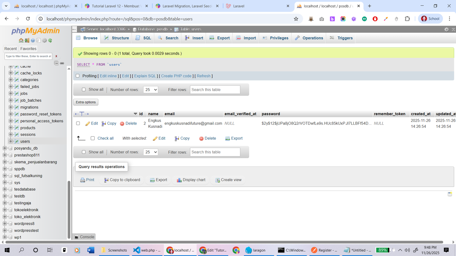 Sekarang cek di localhost/phpmyadmin dan cek di database posdb -> klik tabel “users” harusnya muncul datanya seperti berikut.